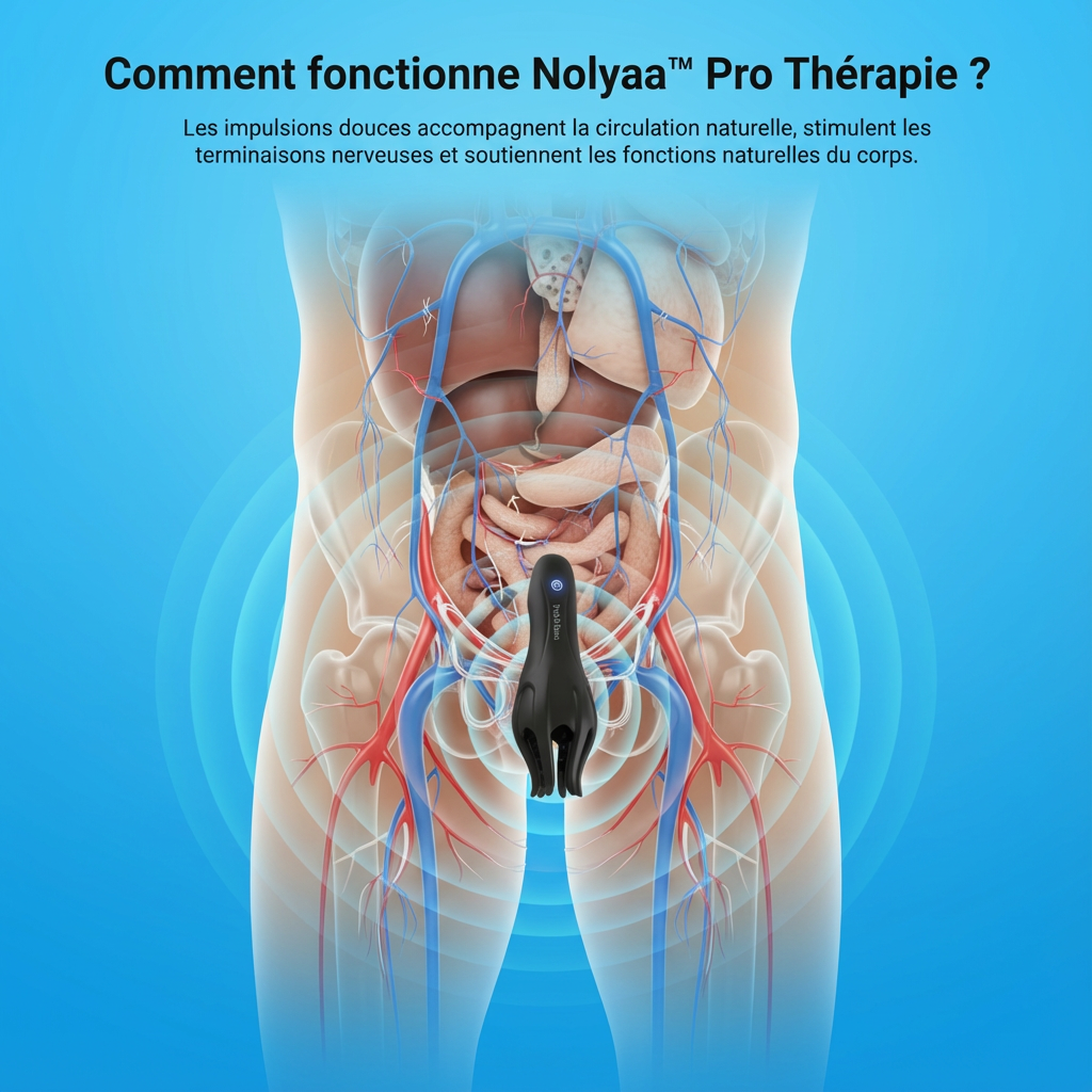 Nolyaa™ utilise une technologie de stimulation douce conçue pour accompagner naturellement la circulation et soutenir la vitalité masculine.
